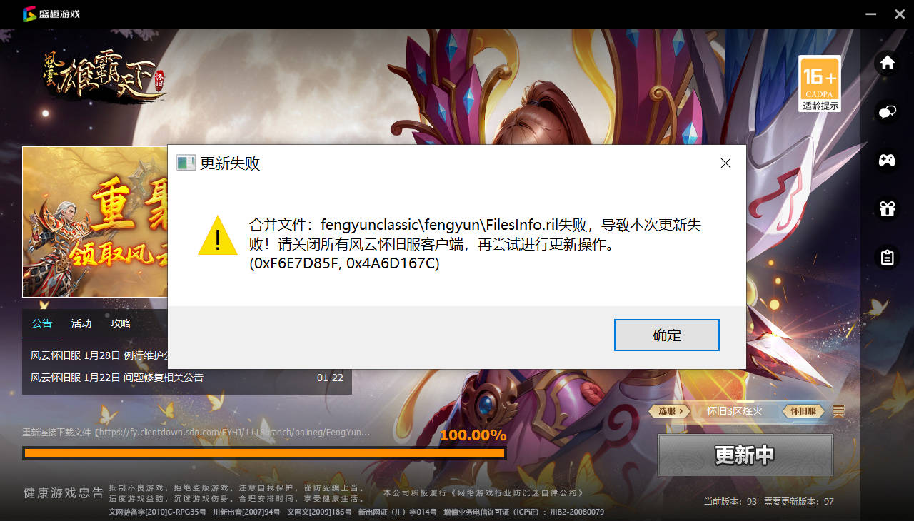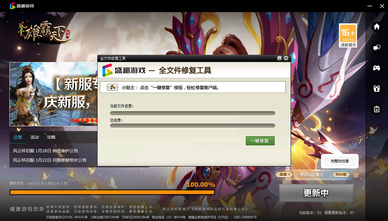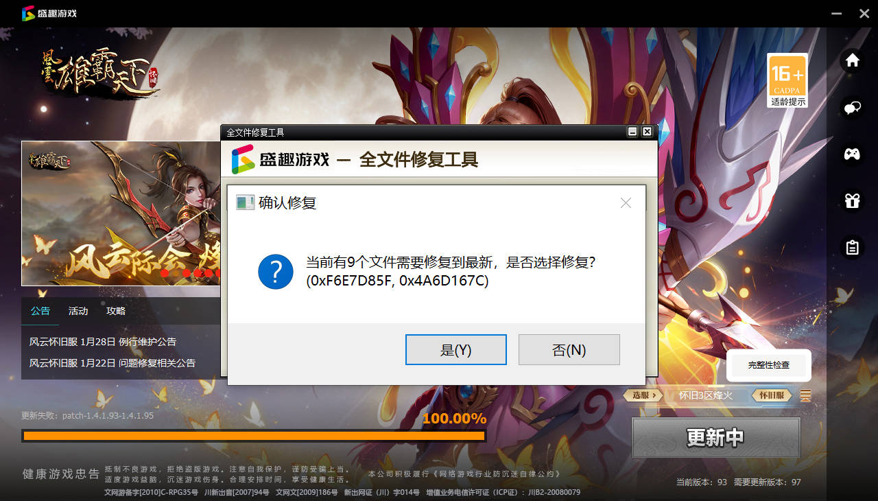 如若因未能完全关闭客户端等情况导致更新出现异常,重试后依然无法完成更新;或者出现类似下图的更新受阻情况时,可采用完整性检查来进行修复