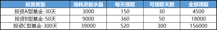 3、 根据投资类型可领取不同天数的灵能水晶,最高可达4倍收益。