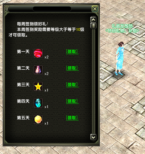 10级以上玩家每日登录后,可在王城NPC“礼品发放员”处进行签到,领取签到好礼 。
