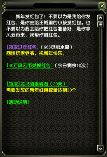 2、累计送出30个红包后,玩家可在新春大使处领取龙马骑乘魂石,每个玩家只能领取一次