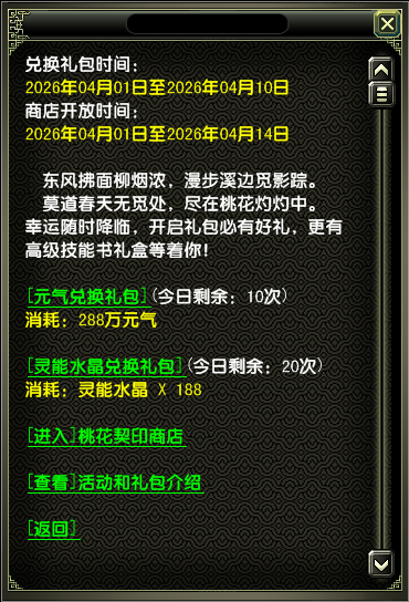 2、活动期间,玩家可以用288W元气兑换1个“桃蕾初萌礼包”(每天可兑换10次)。同时可以用188灵能水晶兑换1个“桃蕾初萌礼包”(每天可兑换20次)。