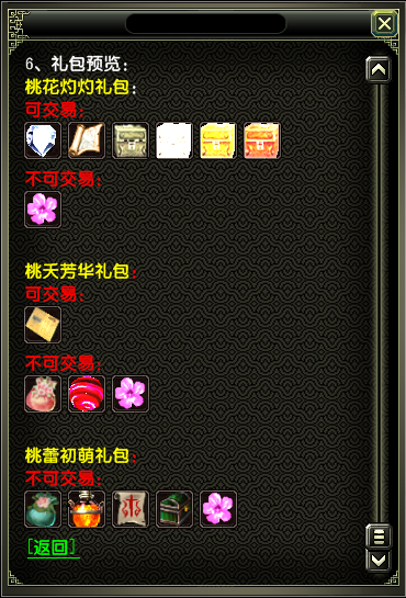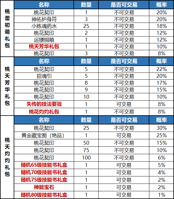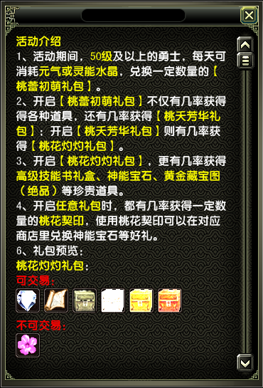 3、开启【桃蕾初萌礼包】时。[确定]开启后会随机获得礼盒内其中一种物品,有概率获得【桃夭芳华礼包】。同样的,开启【桃夭芳华礼包】也会随机获得礼盒内的物品,同样有概率获得【桃花灼灼礼包】。打开【桃蕾初萌礼包】,【桃夭芳华礼包】和【桃花灼灼礼包】有机会获得数量不等的"桃花契印"。 打开【桃夭芳华礼包】有机会获得失传的技法要旨(可交易)。打开【桃花灼灼礼包】有机会获得神能宝石(可交易),黄金藏宝图(绝品)与高等级随机技能书礼盒。