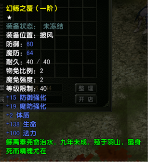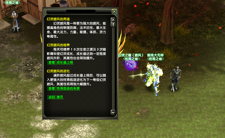 3、在NPC幻灵之瞳处可了解幻灵披风养成的具体规则,披风可以进行加等,洗炼来提升属性,披风升阶将保留加等和附加属性